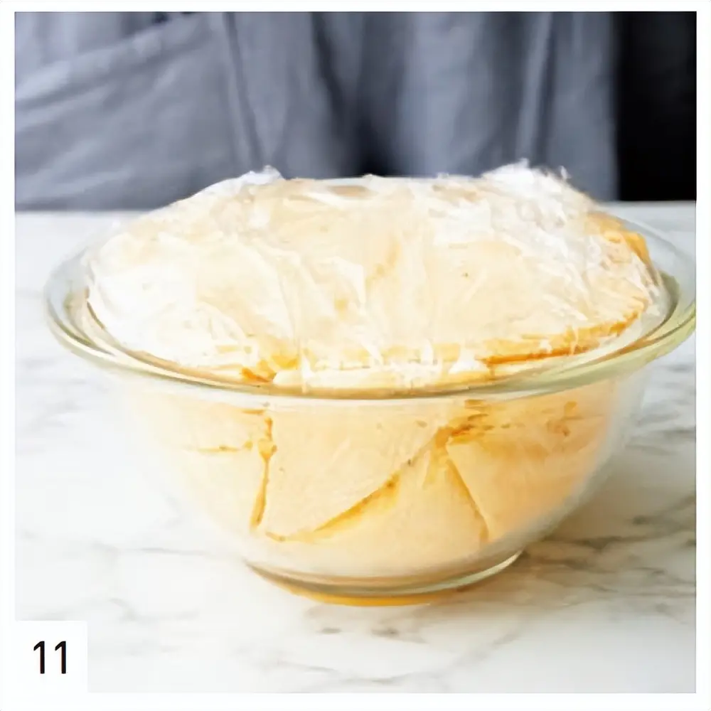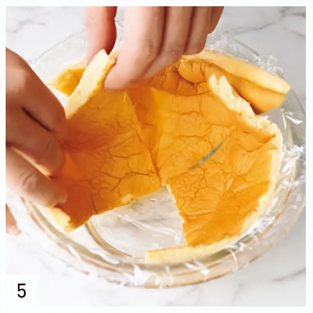 5、在大碗上铺上保鲜膜,将 3 片三角形的海绵蛋糕无缝隙地放进碗里。