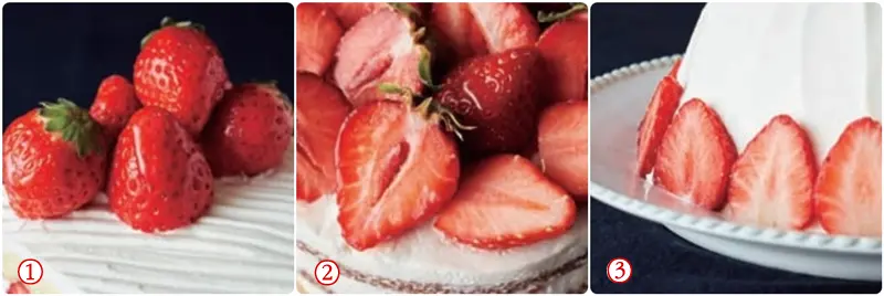 Tips:如果没有刚好大小的草莓用来装饰,上述方法可搭配使用。其他象是将大草莓切成 4等分,或是切块 后再往上堆栈等都可以自由装饰!