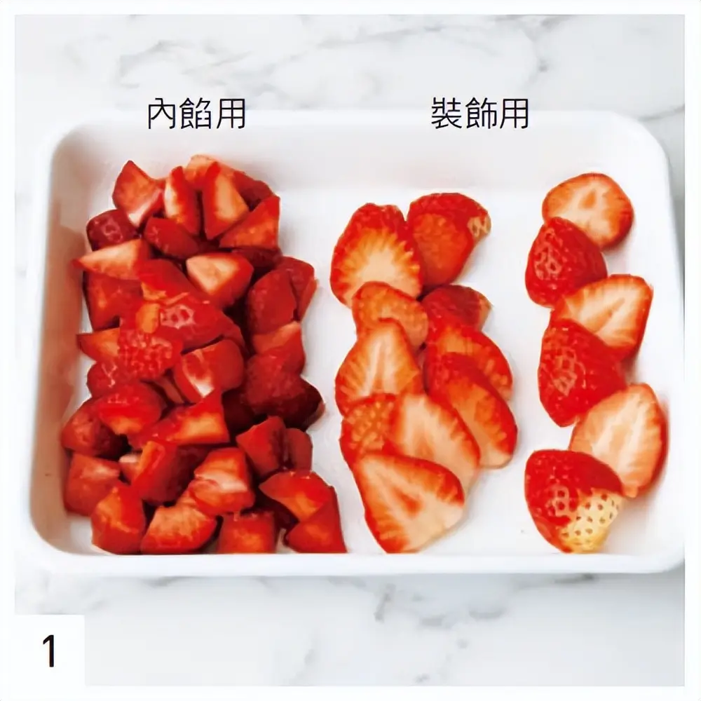 1、将装饰用的草莓去蒂头后 3 颗 切半,3 颗切薄片。剩下的切成 1.5cm左右的块状作内馅用。