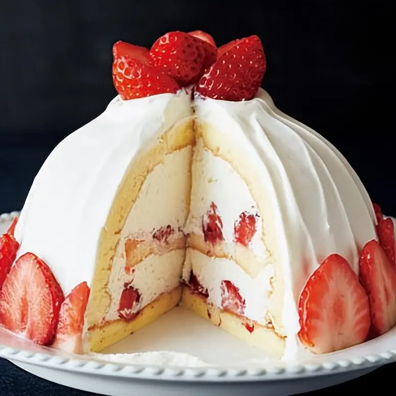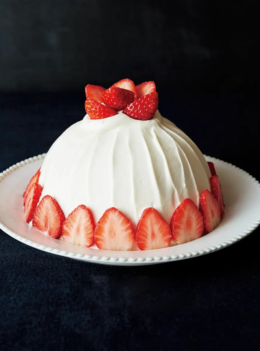14、将切成薄片的草莓装饰在蛋糕侧面,圆顶中央则放射状摆上切半的草莓。