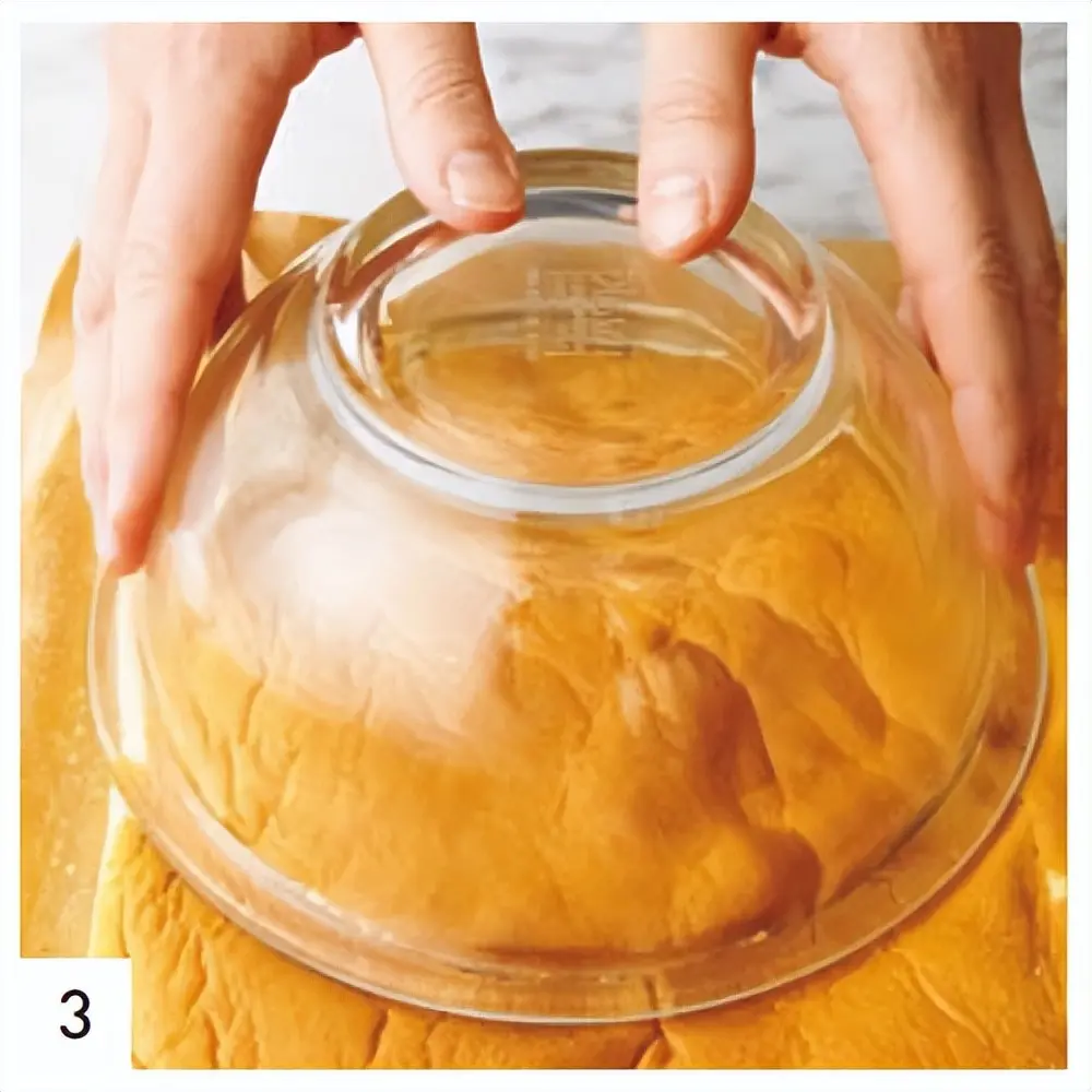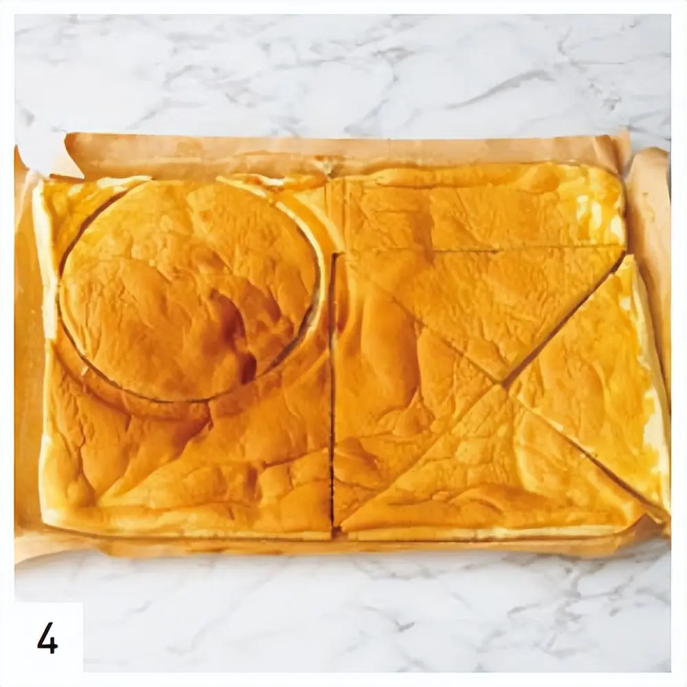 4、再切出比大碗直径略大的正方形(可将碗放在上面比对裁切),再沿着对角线切出 4 个三角形(剩下的海绵蛋糕也有用处,可先收起来)。