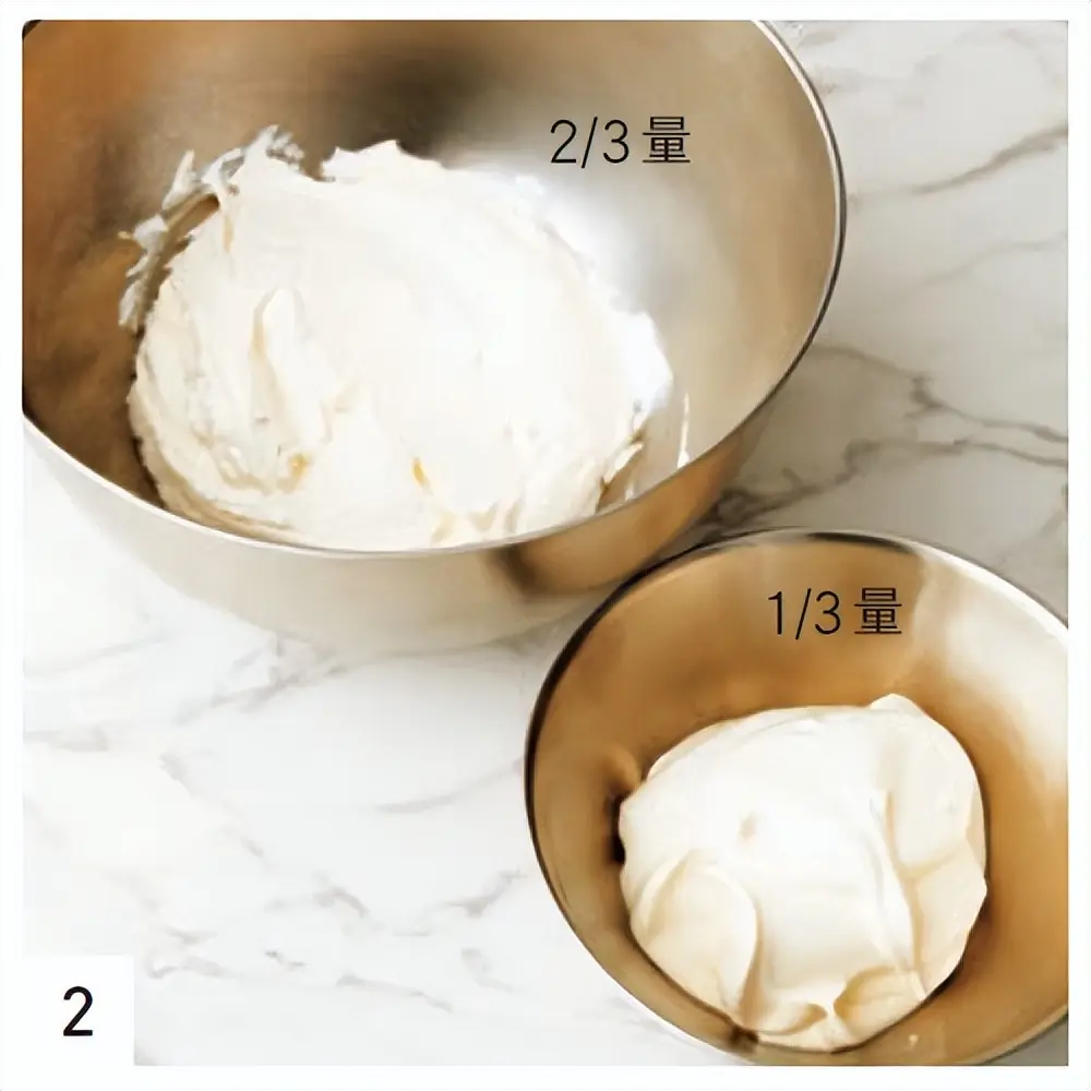 2、在大碗中放入鲜奶油的材料,将大碗底部放在冰水中,以手持搅拌器打至8 分发(取出 1/3 放入冰箱冷藏)。