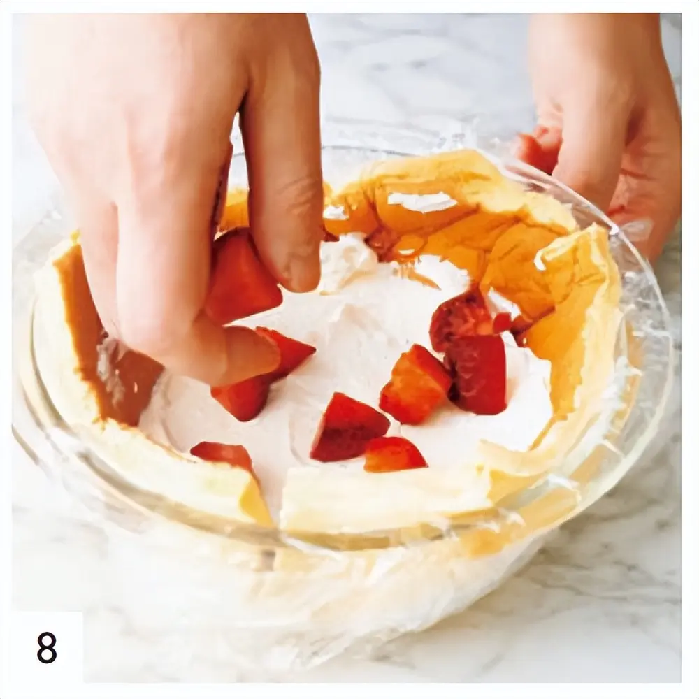 8、倒入一半的鲜奶油,放入内馅用的草莓块。